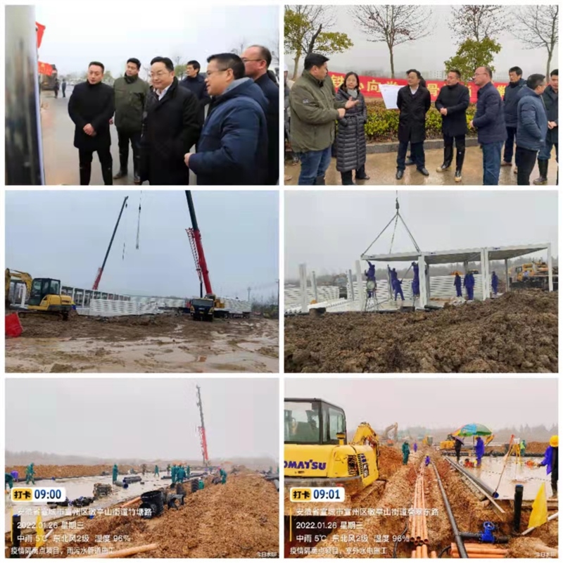 截止1月26日,現(xiàn)場(chǎng)已完成10000平方米混凝土硬化,雨污水管道、室外水電管道安裝進(jìn)展迅速,集裝箱板房開(kāi)始拼裝。天氣惡劣、工期緊迫,一線人員努力克服各種困難和障礙,迎難而上。1月25日下午,區(qū)政府召開(kāi)宣州區(qū)新冠肺炎疫情防控工作專題會(huì)議,審定了隔離點(diǎn)項(xiàng)目方案,明確了相關(guān)事項(xiàng),會(huì)議對(duì)施工進(jìn)度和現(xiàn)場(chǎng)管理給予了充分的肯定,同時(shí)也要求在嚴(yán)把工程質(zhì)量關(guān)和隔離點(diǎn)各項(xiàng)要求的基礎(chǔ)上,倒排工期,加快施工,確保早日交付使用。