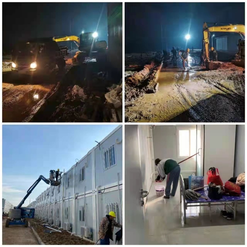 截至2月20日,準(zhǔn)備區(qū)折疊房、緩沖區(qū)活動板房、隔離區(qū)打包房、污水處理點用房已全面安裝完成,室內(nèi)水電、家具、電器安裝近尾聲,室外附屬工程進(jìn)入最后修補(bǔ),隔離點項目保潔工作正在加班加點進(jìn)行。盡管有無盡的疲憊,但各參建方都毫無怨言,鏟泥漿、沖洗道路,清理垃圾……這些看似平常的工作,在這一刻顯得尤為神圣且自豪。