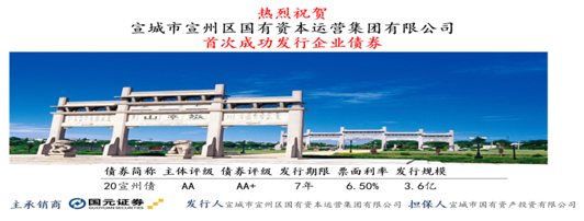 12月2日 ,我公司“2020年宣城市宣州區(qū)國(guó)有資本運(yùn)營(yíng)集團(tuán)有限公司企業(yè)債券”成功發(fā)行。本次債券由國(guó)元證券有限公司主承銷(xiāo),發(fā)行規(guī)模3.6億元,發(fā)行期限7年,主體評(píng)級(jí)AA,債項(xiàng)評(píng)級(jí)AA+,票面利率6.5%。本期債券為我集團(tuán)公司首次公開(kāi)發(fā)行企業(yè)債券,也是宣州區(qū)內(nèi)企業(yè)首次公開(kāi)發(fā)行企業(yè)債券。